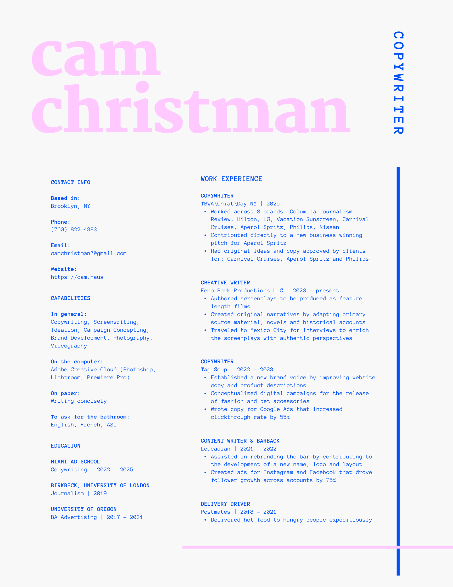 Copywriting, Screenwriting, Ideation, Campaign Concepting, Brand Development & Photography.